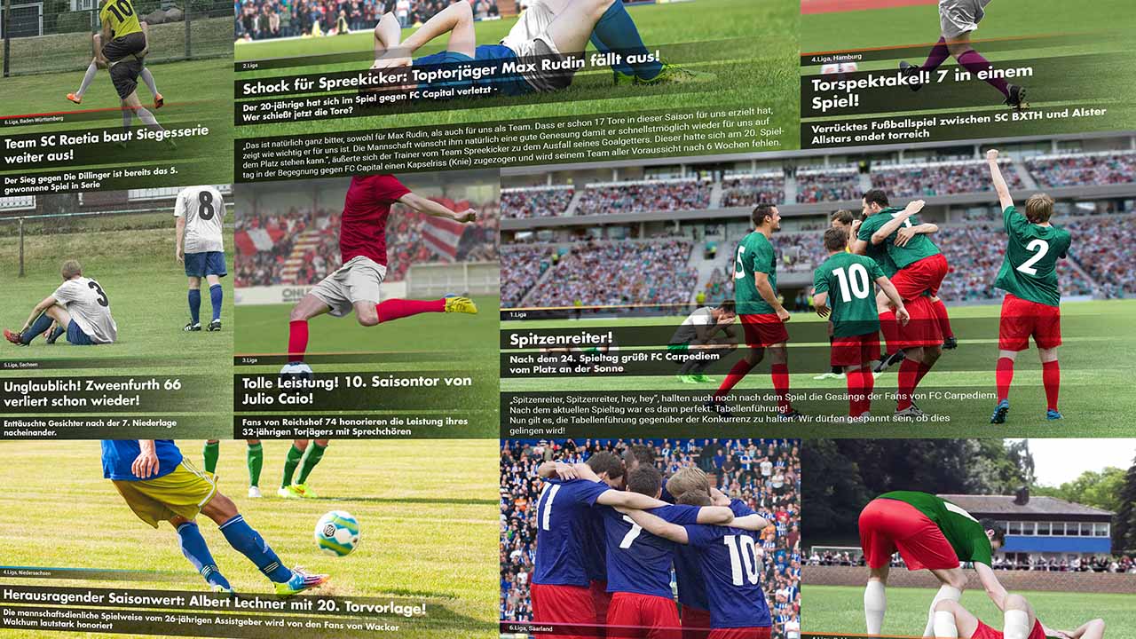 Es geht um kleine Dramen und große Gefühle, um Siegesserien, Transfers, Abstiege, Aufstiege, Torjäger mit Torflaute, Verletzungen, Meisterschaften, Kantersiege und alles, was auch den echten Fußball ausmacht. Dafür haben wir eine eigene Redaktion. So bleibt dein Team immer sichtbar und im Gespräch.